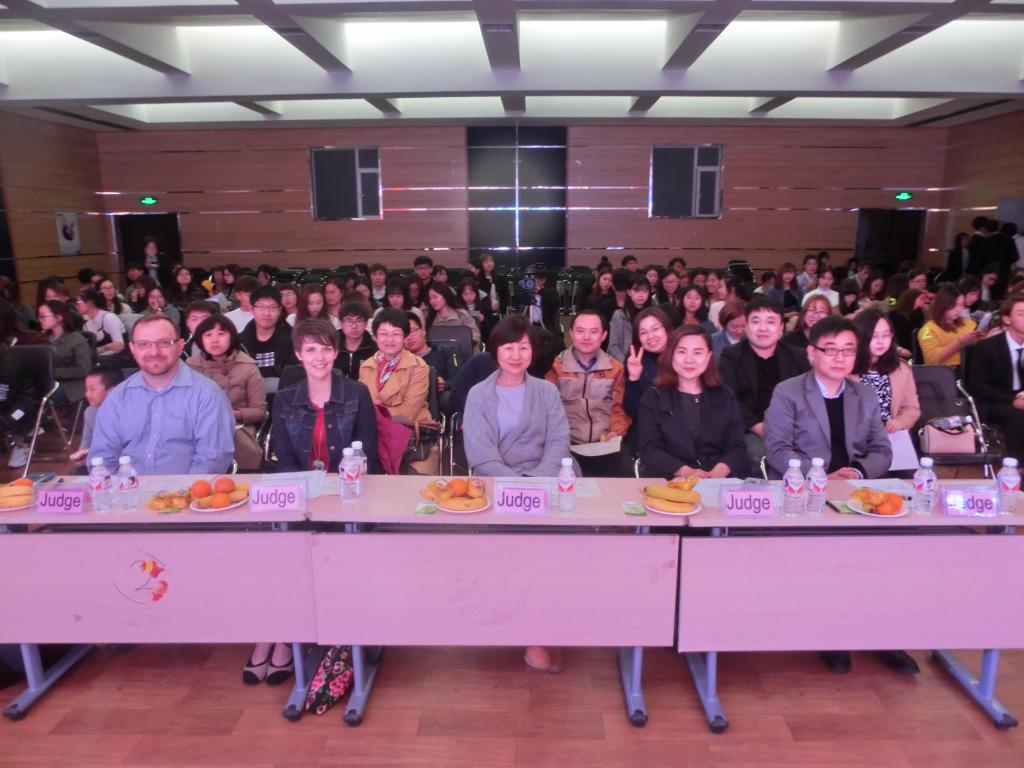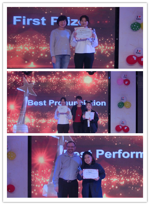 经评委们认真评选,2016级英语教育班的《摩登家庭》荣获一等奖,2016级英语四语班的《疯狂动物城》荣获二等奖,2016级英语文学班的《霍比特人》荣获三等奖。2016级英语四语班《功夫熊猫》、2016英语教育班《斯巴达300勇士》、2016级英语文学班《魔戒》荣获优秀奖。2016级英语教育班的严莉娜同学和英语四语班的崔香花同学荣获最佳语音面貌奖,2016级英语四语班的具谊香同学荣获最佳表现力奖。