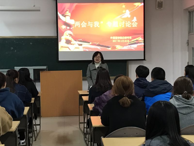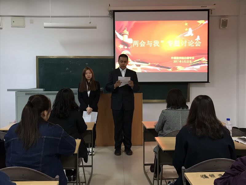 为认真学习贯彻“两会”精神,加深同学们对“两会”的理解,3月22日,日语专业于东部教学楼118教室举办了“两会与我”的专题讨论会活动。日语专业金秀东书记,辅导员郭鲜丹老师出席了本次活动。