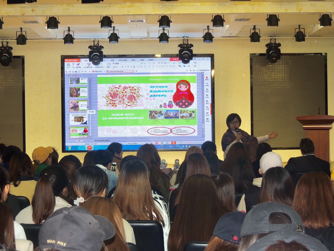 稍后,代表团负责人Петр герасимович 也对郑艳老师的热情欢迎以及此次行程的周到安排表示感谢。他在讲话中提到中俄在教育领域上长期合作,成果丰硕。首先由Евгений Александровис 老师从词源学角度讲解了俄语单词привннй俄罗斯Россия 的来源,使我们对词汇的理解更加深刻。然后他们展示了俄语学子在俄罗斯夏令营活动的情况。