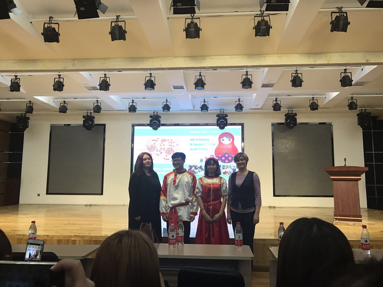 会上,Volkova Svetlana和Alenshchenko Valentina老师介绍了夏令营活动,活动内容精彩充实,增长同学们的见识。她们还与员工们互动,用俄语绕口令活跃了全场气氛,随后俩人代表俄方高校,赠送了她们精心准备的富有俄罗斯特色的手工艺品与精致的俄罗斯民族服装。礼品典雅精致,富有俄罗斯传统韵味,赢得员工们的阵阵赞叹。会后,同学穿着从俄罗斯带来的服装上台与老师合影留念,欢笑连连。