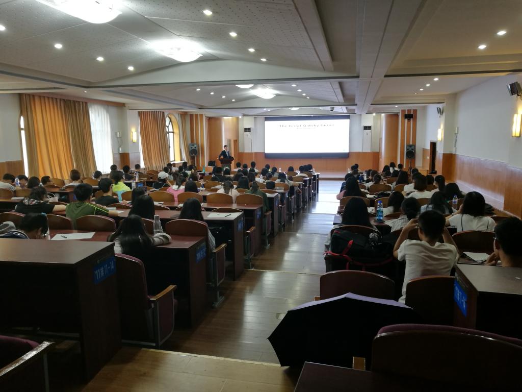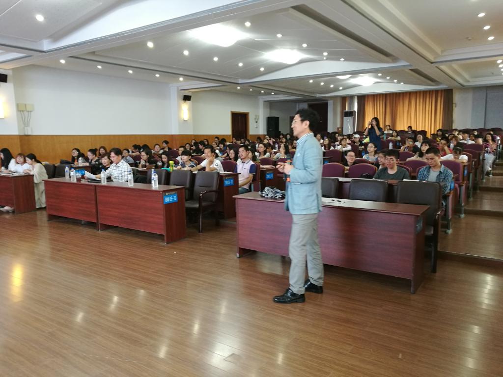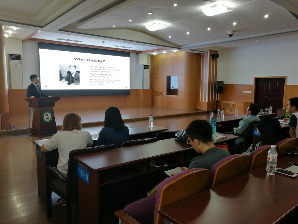 2017年7月20日下午,w88优德英语系举行了两场专题讲座。第一场是韩国全北大学英语教育专业教授,Hee-chul Lee主讲的“Verb Classes and Their Linguistic Behaviors”;第二场是韩国汉阳大学英语专业教授,Seongho Yoon主讲的“《了不起的盖茨比》与美国梦”。本次讲座从语言学和文学两种不同角度出发,向员工展示了英语语言学习中深层次的语言活动和文化底蕴。语言学方面侧重的是英语动词在语言活动中的具体应用和细微差别;而文学方面则通过对《了不起的盖茨比》中美国梦的分析,揭示了物质追逐的梦想与残酷现实之间的差距,同时展现了小说语言所具有的音画之美和撼动人心的能力。这次讲座的目的就是要让员工们认识到,学习语言并不能只停留在文字符号的习得层面,而必须更进一步发现语言表层下所蕴藏的多层次的语言与文化内涵。